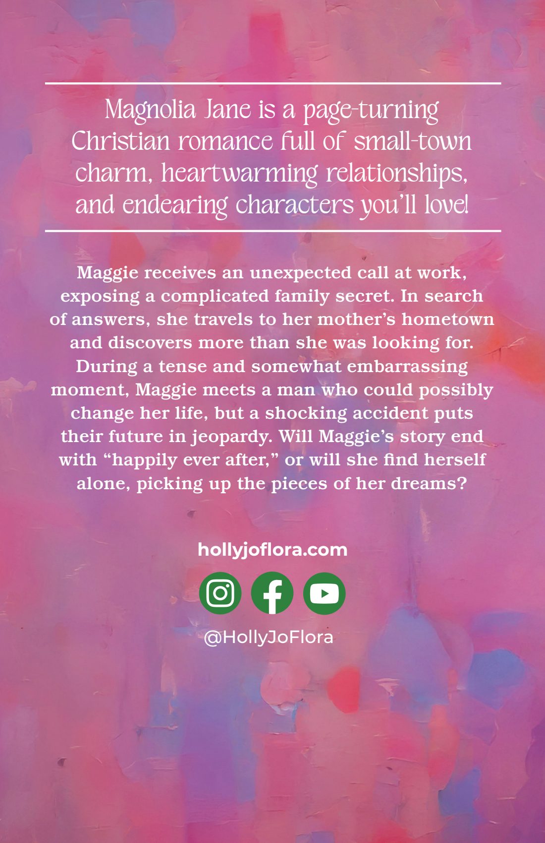 Magnolia Jane is a page-turning Christian romance full of small-town charm, heartwarming relationships, and endearing characters you’ll love!