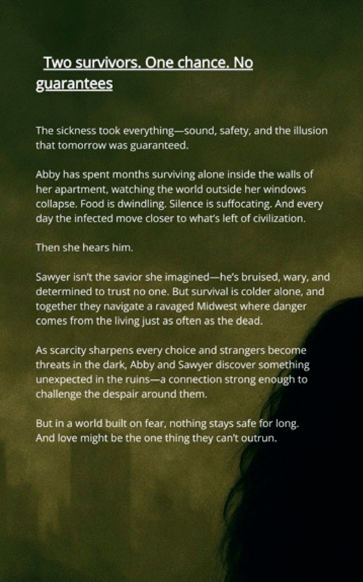 Sawyer isn’t the savior Addy imagined. He’s wary, hardened, and determined to trust no one. But survival is colder alone. Together, they navigate a ravaged Midwest where danger comes from the living just as often as the dead.