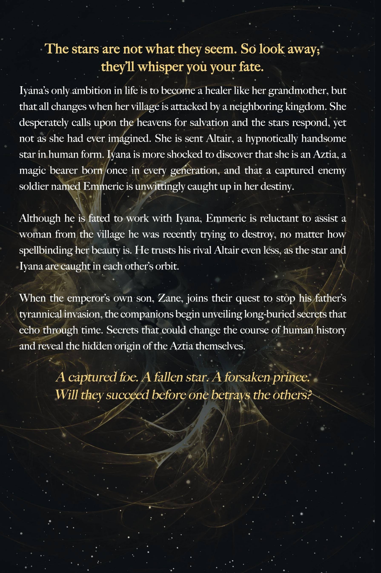 Iyana's only ambition in life is to become a healer like her grandmother, but that all changes when her village is attacked by a neighboring kingdom. She desperately calls upon the heavens for salvation and the stars respond, yet not as she had ever imagined. She is sent Altair, a hypnotically handsome star in human form. Iyana is more shocked to discover that she is an Aztia, a magic bearer born once in every generation, and that a captured enemy soldier named Emmeric is unwittingly caught up in her destiny.