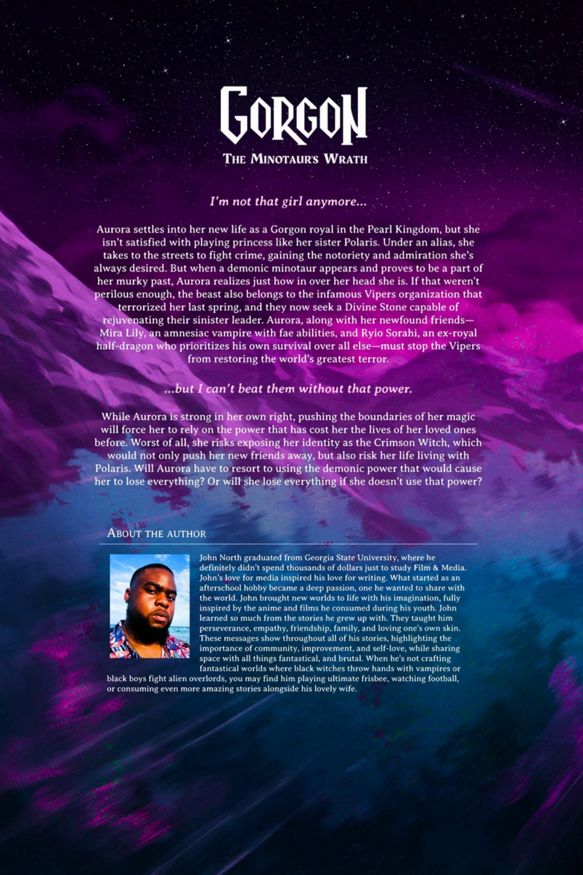 Aurora settles into her new life as a Gorgon royal in the Pearl Kingdom, but she isn’t satisfied with playing princess like her sister Polaris. Under an alias, she takes to the streets to fight crime, gaining the notoriety and admiration she’s always desired. But when a demonic minotaur appears and proves to be a part of her murky past, Aurora realizes just how in over her head she is. If that weren't perilous enough, the beast also belongs to the infamous Vipers organization that terrorized her last spring, and they now seek a Divine Stone capable of rejuvenating their sinister leader. Aurora, along with her newfound friends—Mira Lily, an amnesiac vampire with fae abilities, and Ryio Sorahi, an ex-royal half-dragon who prioritizes his own survival over all else—must stop the Vipers from restoring the world's greatest terror.