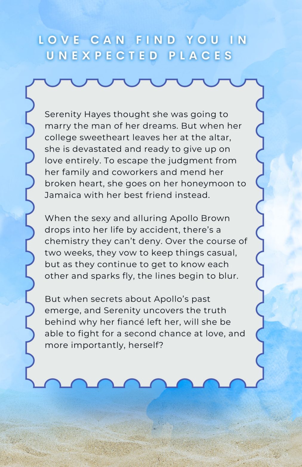 Serenity Hayes thought she was going to marry the man of her dreams. But when her college sweetheart leaves her at the altar, she is devastated and ready to give up on love entirely. To escape the judgment from her family and coworkers and mend her broken heart, she goes on her honeymoon to Jamaica with her best friend instead.